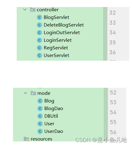 我们这个项目需要用到两张表:User用户表和Blog博客表,M层应该有分别对应这两张表的实体类User类和Blog类。另外还应该有对这两张表中数据分别处理的UserDao类、BlogDao类,用来对完成数据的处理(新增、删除、查询等)