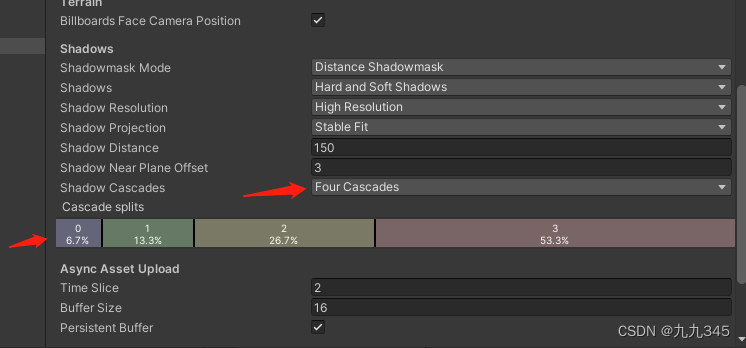 Unity可以在Project setting里可以进行级联阴影分级的设置: