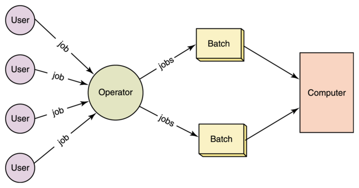 在**批处理系统(Batch System)**类型的操作系统中,用户定期(如每天、每周、每月)将作业提交到一个中心位置,该位置的系统用户不直接与计算机系统交互。为了加快处理速度,具有类似需求的作业被分批处理,并作为一个组在计算机中运行。因此,程序员将把程序留给操作员,每个作业的输出将发送给适当的程序员。这种类型的主要任务是自动将控制权从一个作业转移到下一个作业。