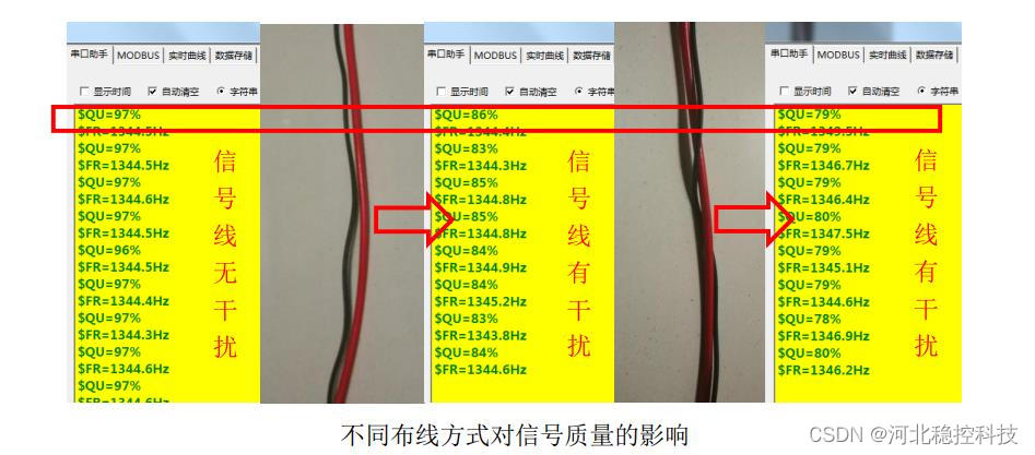 上图中,左侧为不受其它信号干扰的测量结果,信号质量 97%,振弦频率基本在小数点后0.2Hz 跳动, 中间为振弦传感器信号线与 5V 直流电线平行走线的测量结果,信号质量下降为 80%左右, 数据跳动最大达到 1.5Hz, 右侧为将 5V 电线与振弦信号线缠绕的测量结果, 数据跳动最大达到 5Hz。