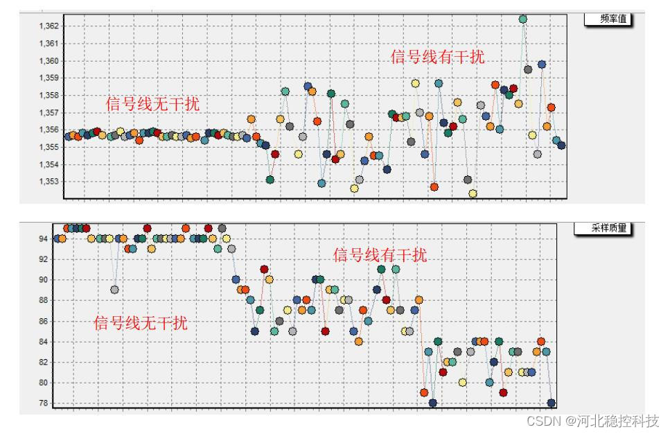 ( 9) 严禁传感器信号线与其它带电线路接触( 包括其它弱电或信号线)。 下图是振弦传感器线路单独走线以及和其它弱电信号交叉走线对传感器测量精度的对比。