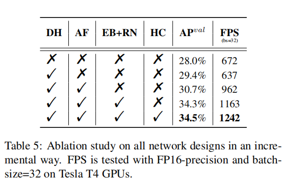 TOOD的另一个主要贡献是关于任务状头(T-head)。T-head堆栈卷积层来构建交互式特性,在此之上使用了任务对齐预测器(TAP)。PP-YOLOE [45]用轻量级ESE注意取代T-head的层注意,形成ET-head。然而,我们发现ET-head会恶化我们模型的推理速度,它没有精度增益。因此,我们保留了我们的高效解耦头的设计。