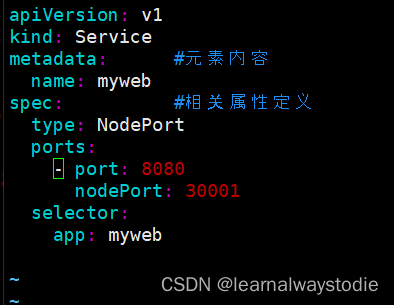 type: NodePort 和 nodeport: 30001 表示Service开启了NodePort格式的外网访问模式