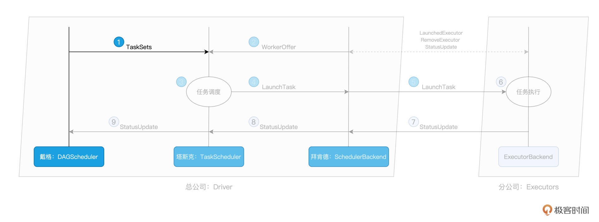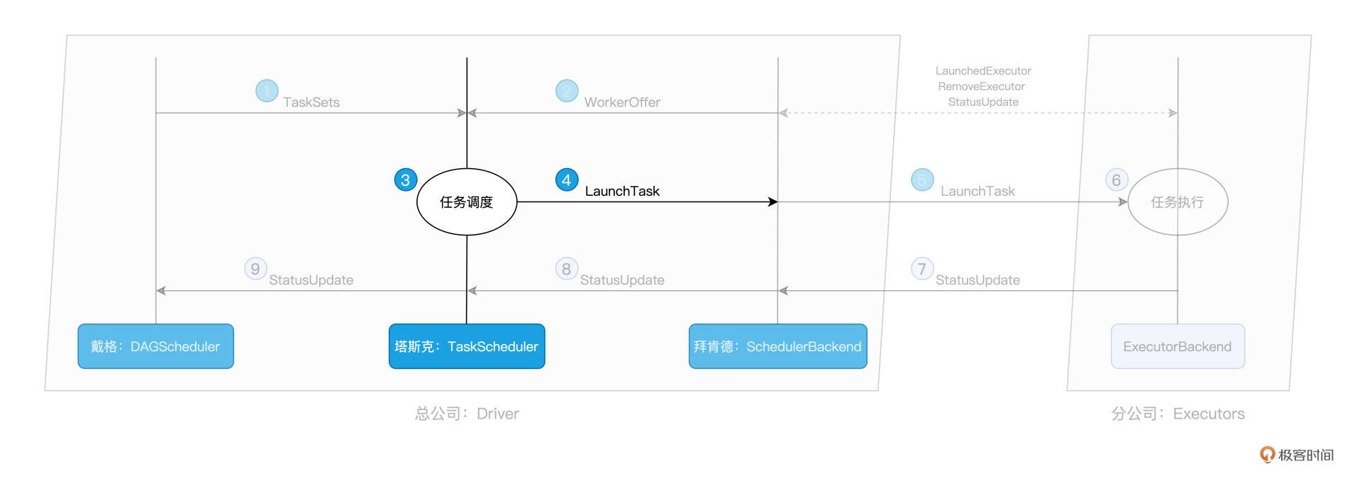 SchedulerBackend 与集群内所有 Executors 中的 ExecutorBackend 保持周期性通信,双方通过 LaunchedExecutor、RemoveExecutor、StatusUpdate 等消息来互通有无、变更可用计算资源。拜肯德正是通过这些小弟发送的“信件”,来不停地更新自己手中的那本小册子,从而对集团人力资源了如指掌。