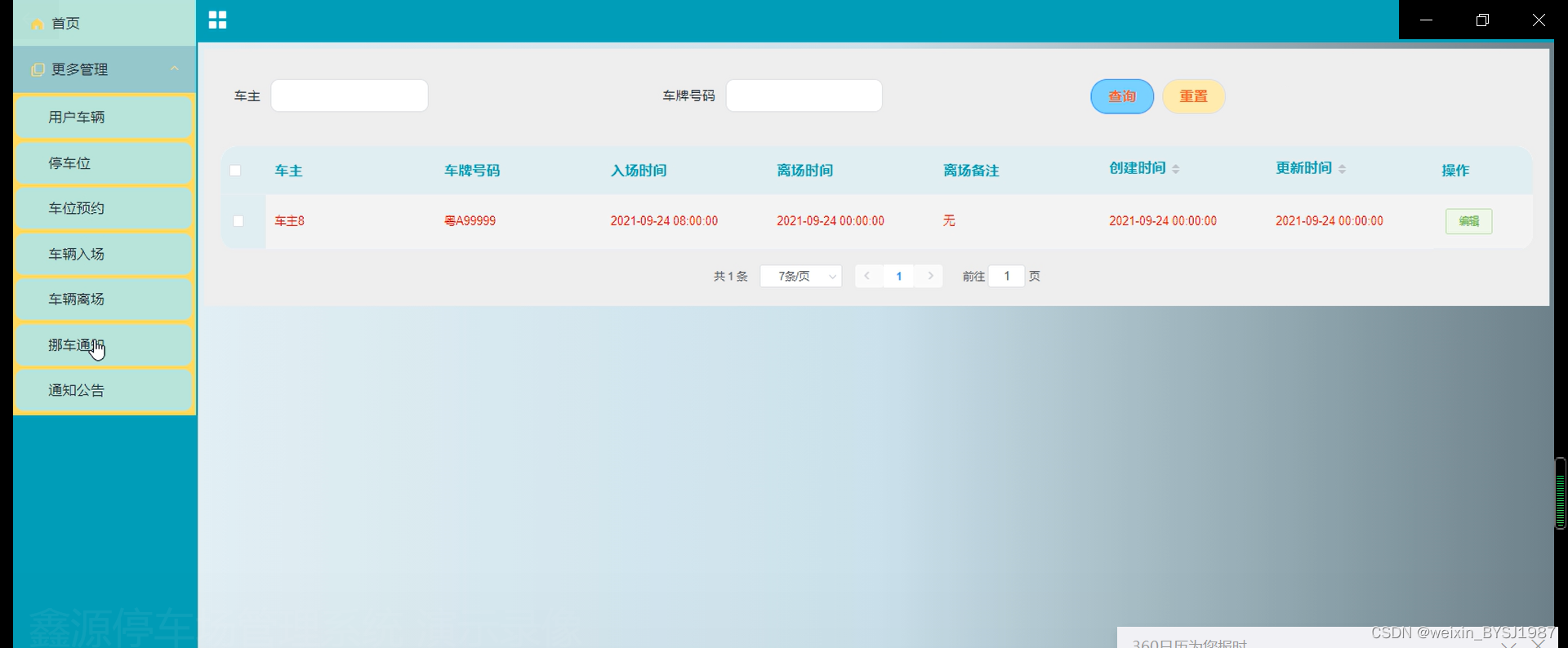 The system realizes the computerized management of various work processes within the parking lot management, including the home page of the administrator, user management (administrator) and more management (owner, user vehicle, parking space, parking space reservation, vehicle admission, vehicle departure, vehicle moving notice, notice announcement, security personnel, personnel scheduling, license plate recognition) and other functions.