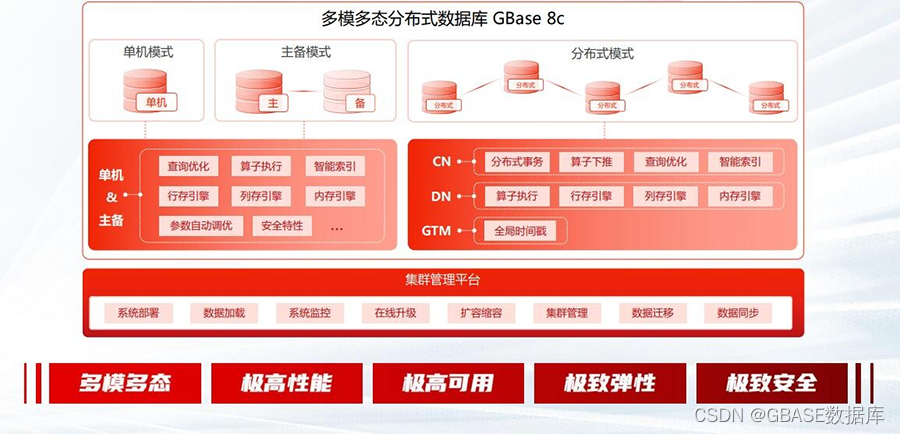 GBase 8c是基于openGauss3.0构建的多模多态原生分布式数据库,支持行存、列存、内存等多种存储模式和单机、主备与分布式等多种部署形态。