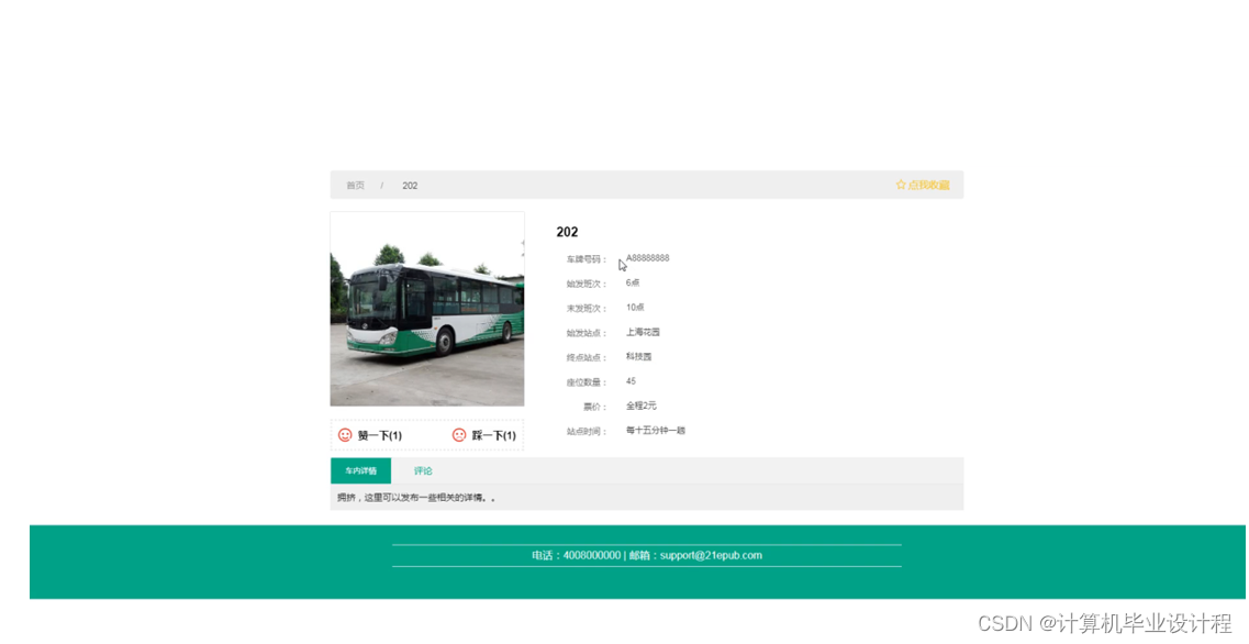 公交车辆,在公交车辆页面可以查看公交车号、车牌号码、始发班次、末发班次、始发站点、终点站点、座位数量、票价、站点时间等详细内容,进行赞、踩,如图5-3所示。