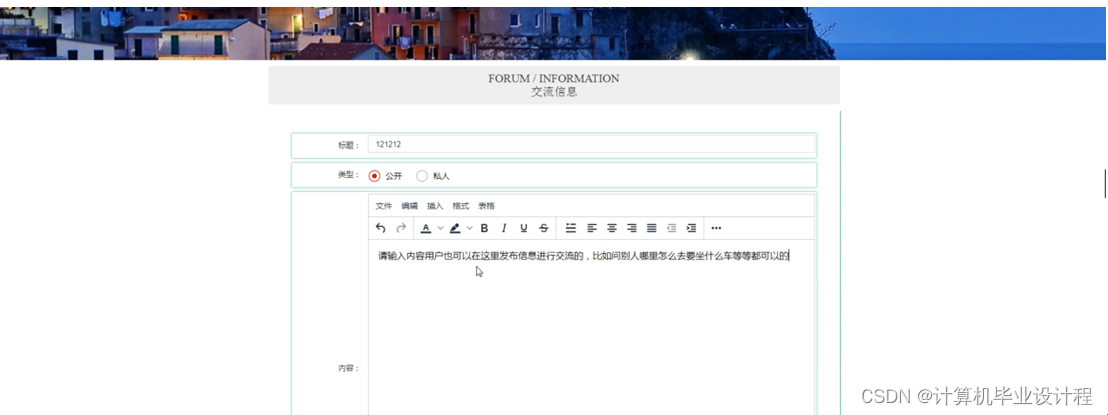 交流信息,在交流信息页面通过填写帖子标题、类型、内容等信息进行发布帖子,如图5-6所示。