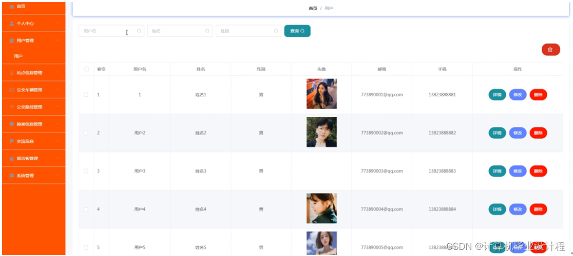 用户管理,在用户管理页面可以对索引、用户名、姓名、性别、头像、邮箱、手机等内容进行详情、修改或删除操作,如图5-11所示。