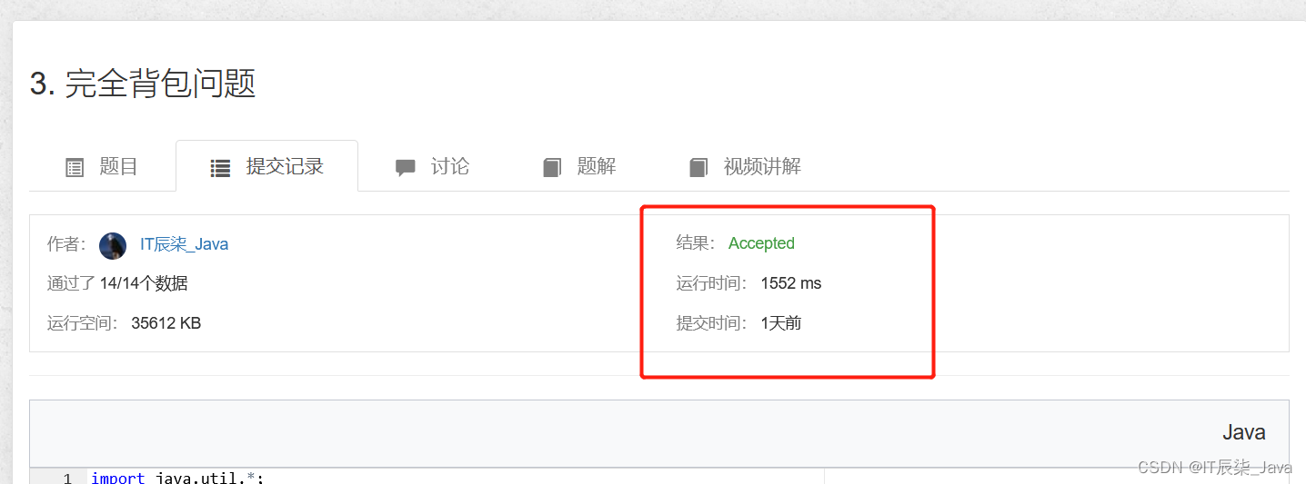 0 输入样例 输出样例: 思路分析:在上篇博客博主就已经介绍了0/1背包问题,那么完全背包问题跟0/1背包问题的区别就是它考虑前i个物品每个物品可以被多次选择。 那么,老规矩,我们根据状态规划可以得到: (朴素解法) 1、曲线救国,去掉k个物品i 2、求max:f[i-1,j-k*v[i]] 3、在加回来k个物品i 由此得到我们的状态转移方程为:f[i-1,j-v[i] * k] + k*w[i] 代码实现: 运行结果: 我们可以发现运行时间非常的慢,那么什么原因呢?一方面是因为Java语言实现数据结构本身就比较慢,可以看到我们的代码是通过了3层循环来实现,最坏情况下时间复杂度是(n * v^2),时间复杂度很高,那么是否可以优化该背包问题的代码呢? 通过比较0/1背包问题,通过f[i,j] 和 f[i,j-v] 的递推公式我们可以发现,若要求得f[i,j-v]的最大值,只需要求出f[i,j]的最大值在加上一个w[i]即可,具体如下: 代码实现: 运行结果: 我们发现快了整整2000ms,因为优化后的代码少了一层循环,还是很可观的。 代码实现: 注意我们这里的j是从v[i]开始的,即从小到大,与0/1背包问题不同的是0/1背包问题是从大到小, 原因:简单来说,一维情况正序更新状态f[j]需要用到前面计算的状态已经被「污染」,逆序则不会有这样的问题。 问题描述 有 N 种物品和一个容量是 V的背包。 第 i种物品最多有 si 件,每件体积是 vi,价值是 wi。 求解将哪些物品装入背包,可使物品体积总和不超过背包容量,且价值总和最大。 输入格式 第一行两个整数,N,V,用空格隔开,分别表示物品种数和背包容积。 接下来有 N行,每行三个整数 vi,wi,si,用空格隔开,分别表示第 i种物品的体积、价值和数量。 输出格式 输出一个整数,表示最大价值。 数据范围 0 输入样例 输出样例: 思路:我们可以模仿完全背包问题的朴素解法直接写出代码: 运行结果: 那么如果题目给的n,v,s的比较大的话,暴力解法接不能通过了,这就需要我们考虑如何来进行优化。 博主对于本题的二进制优化也是第一次接触到,通过查阅了不少资料并且反复观看了讲解视频后的个人总结心得: 1、在完全背包中,我们可以通过两个状态转移方程: f[i,j]=max(f[i−1,j],f[i−1,j−v]+w,f[i−1,j−2v]+2w,f[i−1,j−3v]+3w,.....) f[i,j−v]=max(f[i−1,j−v],f[i−1,j−2v]+w,f[i−1,j−2v]+2w,.....) 2、在多重背包中,我们的推导过程为: f[i,j] = max(f[i−1,j],f[i−1,j−v]+w,f[i−1,j−2v]+2w,.....f[i−1,j−Sv]+Sw,) 我们可以发现f[i,j−v]的最后一项比f[i,j]多出来一项,这就令人很是难受,对于完全背包问题我们直接对求的结果在加上个w[i]便可求出最大值,那么对于本题我们首先要了解一点: 怎么比完全背包方程比较就多出了一项? 其实,一般从实际含义出发来考虑即可,这里是在分析f[i,j−v]这个状态的表达式,首先这个状态的含义是 从前i个物品中选,且总体积不超过(j-v)的最大价值, 我们现在最多只能选s个物品,因此如果我们选s个第i个物品,那么体积上就要减去 s∗v,价值上就要加上s∗w,那更新到状态中去就是 f[i−1,j−v−s∗v]+s∗w,提取公因式v,也就是f[i−1,j−(S+1)v]+Sw。 简单来说就是比如系统给出一个数1023,那么按照常规惯例一个一个枚举我们是不是要枚举1023次才能得到这个结果,那么二进制优化是怎么做的呢?比如1023,那么我们可以通过2^0,2^1,2^2 ……2^k,这里的k应该是9,为什么是9呢,因为用2^0~2^9之间的数字拼凑可以任意用来表示1~1023之间的任何数字,这样就大大减少了我们的枚举数量,也就是一个时间复杂度从Si -> logSi的一个提高,这里我参照了网上的一个特别有意思的案列,可以根据这个案列来理解: 二进制优化思维就是:现在给出一堆苹果和10个箱子,选出n个苹果。将这一堆苹果分别按照1,2,4,8,16,.....512分到10个箱子里,那么由于任何一个数字x∈[0,1023] (第11个箱子才能取到1024,评论区有讨论这个)都可以从这10个箱子里的苹果数量表示出来,但是这样选择的次数就是 ≤10次。 比如: 如果要拿1001次苹果,传统就是要拿1001次;二进制的思维,就是拿7个箱子就行(分别是装有512、256、128、64、32、8、1个苹果的这7个箱子),这样一来,1001次操作就变成7次操作就行了。 这样利用二进制优化,时间复杂度就从 O(n^3) 代码实现: 问题描述 有 N 组物品和一个容量是 V的背包。 每组物品有若干个,同一组内的物品最多只能选一个。 求解将哪些物品装入背包,可使物品总体积不超过背包容量,且总价值最大。输出最大价值。 输入格式 第一行有两个整数 N,V,用空格隔开,分别表示物品组数和背包容量。 接下来有 N组数据: 输出一个整数,表示最大价值。 数据范围 0 输入样例 输出样例: 思路非常简单,首先读懂题目,然后根据题意,朴素解法就可。 代码实现:10