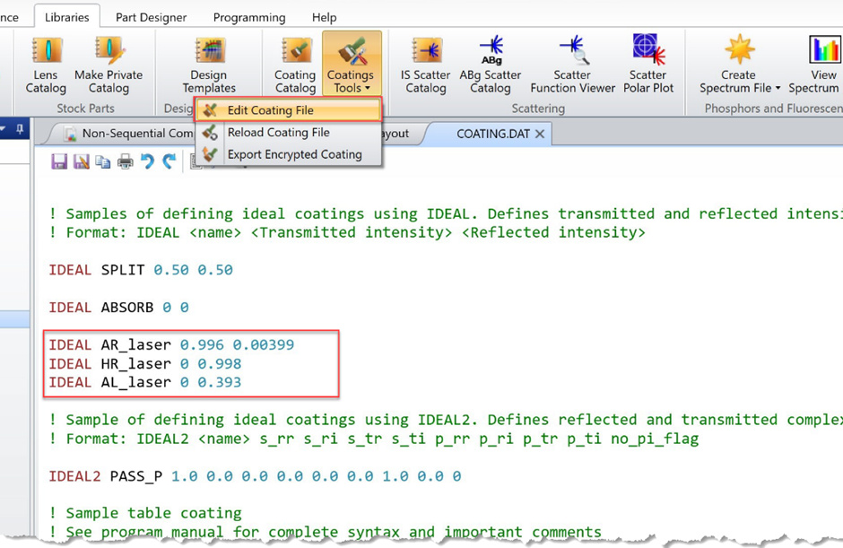 在非序列模式下测量的吸收通量同时考虑了由膜层引起的表面吸收和镜头材料的体吸收。透射元件具有抗反射膜层,反射镜具有高反射膜层。我们在本例中使用了简单的 IDEAL 膜层,格式为 IDEALT R TIR。语法中的三个强度系数分别表示透射 T、反射 R和全内反射 TIR。吸收系数通过 A = 1.0 - R - T 自动计算,以表示能量吸收效率。如果省略了 TIR 值,则假定其值为 1.0。我们在膜层文件中添加了以下两种 IDEAL 膜层,以备后续使用。可以通过点击库……膜层工具……编辑膜层文件(Libraries…Coating Tools…Edit Coating File)来完成编辑。我们将编辑好的膜层文件保存为“COATING_LASER.DAT”。