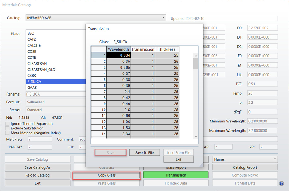 要使用 F_SILICA 的真实体吸收数据,请参考 OHARA网站,我们应先将上述材料库保存为新的自定义材料库,例如 MYCATALOGAGF。然后,我们可以在这个自定义玻璃库中编辑 F_SILICA 的透射数据,如下图所示。