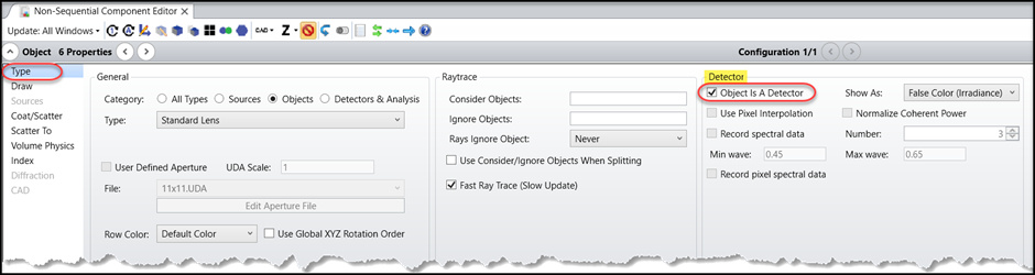 除了添加体探测器物体,我们还将打开所有光学和光机元件的 物体作为探测器(Object is A Detector) 选项。这将帮助我们记录这些物体表面吸收的照度。可以将任意形状的大多数物体用作探测器来记录非相干照度数据。这包括具有平面的物体,例如多边形、STL 和矩形体物体。该选项可以在物体属性……类型……探测器部分下启用。选中该选项后,用于绘制物体的每个单独的三角面可以变成单个像素,像素的数量与该物体的绘图分辨率相关。探测到的辐照度既可以在实体模型中直观地显示,也可以在探测器查看器的文本选项卡中显示为文本列表。