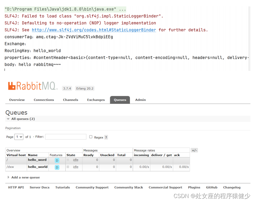 - channel.queueDeclare("hello_world",true,false,false,null)