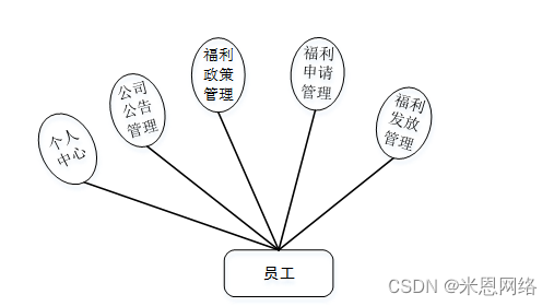 (b)员工进入系统可以实现个人中心、公司公告管理、福利政策管理、福利申请管理、福利发放管理等功能。员工用例图如图3-2所示。