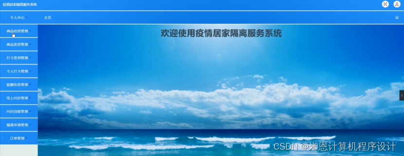 管理员登录进入疫情居家隔离服务系统可以查看主页、个人中心、用户管理、服务人员管理、商品信息管理、商品类型管理、系统管理等功能进行详细操作,如图4-6所示。