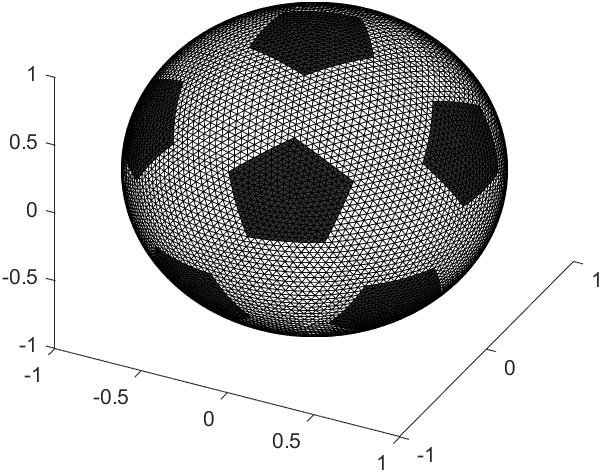 很明显足球每个面是个球面,我们就想对足球进行曲面插值,这里直接用了工具箱Partial Differential Equation Toolbox的给定轮廓三角剖分的过程,对于每个面进行细密三角化。