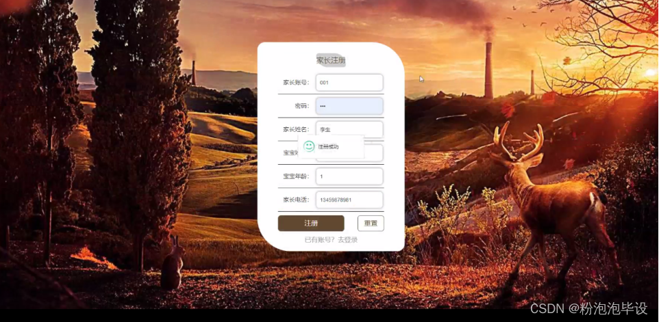 家长注册,在注册页面填写家长账号、密码、家长姓名、宝宝姓名、宝宝年龄、家长电话等详细信息进行注册,如图5-19所示。