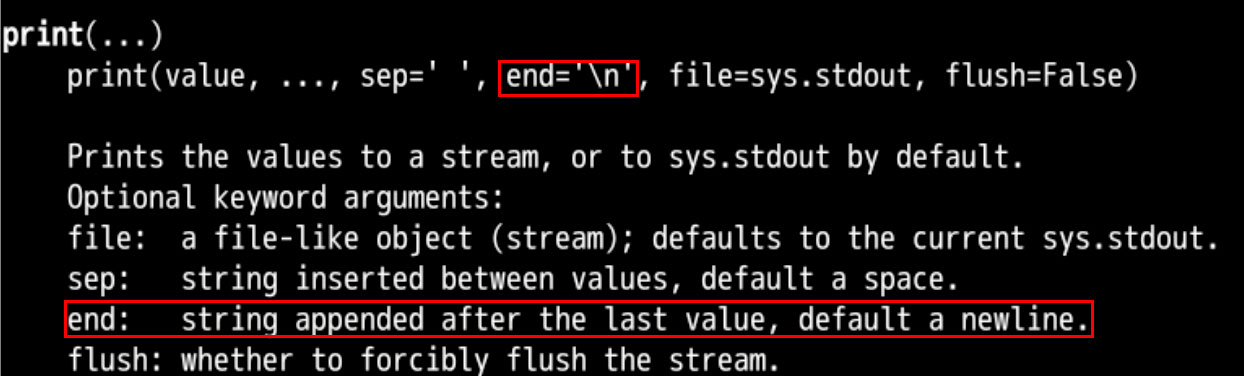 print函数end参数end参数 的值可以是任意字符串end参数 的值会输出到结尾位置end参数 的默认值是 \nend是空串(end="")\n)