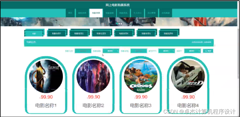 网上电影购票系统,在系统首页可以查看首页,影院信息,电影信息,电影排期,电影资讯,个人中心,后台管理,在线客服等内容,并进行详细操作;如图5-1所示。