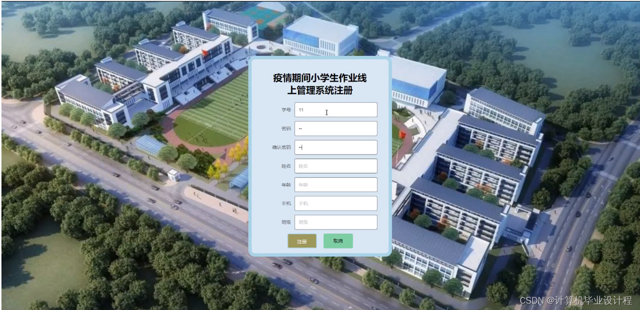 学生注册,在学生注册页面通过填写学号,密码,确认密码,姓名,年龄,手机,班级等信息进行注册操作,如图5-1所示。