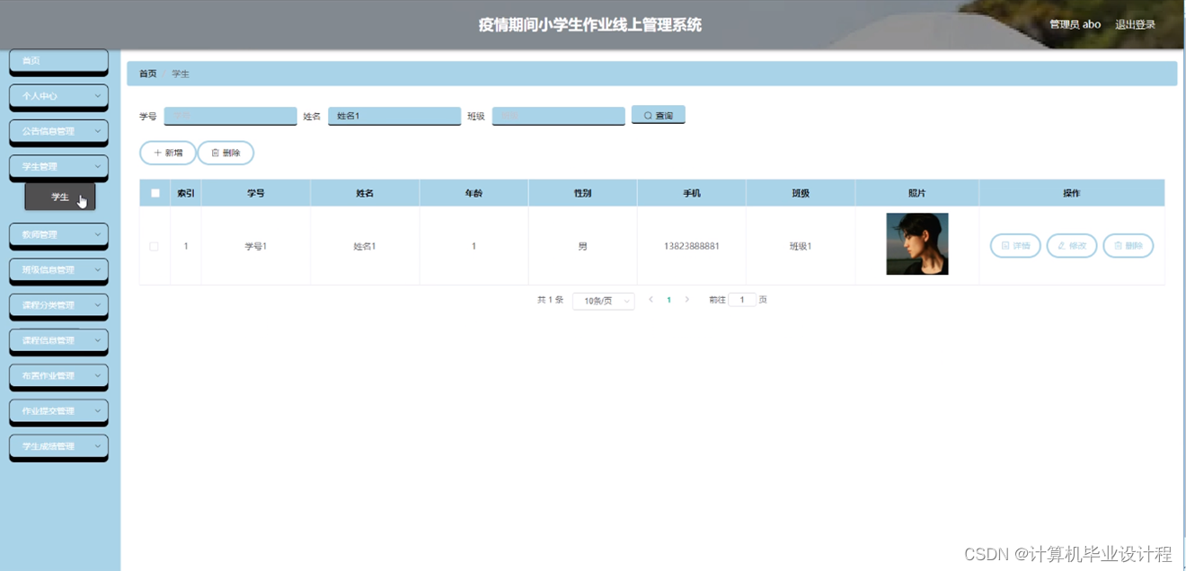 学生管理,在学生管理页面可以对索引,学号,姓名,年龄,性别,手机,班级,图片等信息进行详情,修改和删除等操作,如图5-6所示。