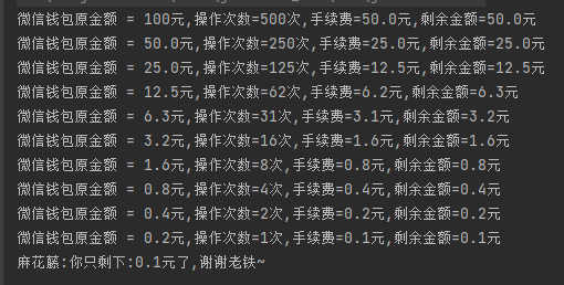 首先,100 元,如果我每次只提取 0.1 元,收取 0.1 元手续费,那么当我操作 500 次之后,我还有 50 元。500 次,刚好是微信余额,100 元乘以 10,单位转化为角之后,再除以 2。