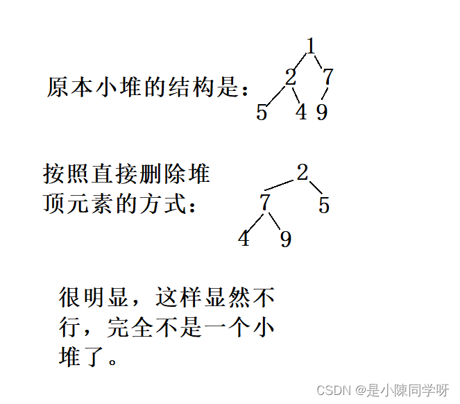 显然没有这么简单,因为如果我们直接删除了堆顶的元素,然后所有的数往前面移动了一位,它们的位置全部发生了变化,小堆的结构也不存在了,而且自己孩子可能会变成自己的兄弟,这显然是不允许的。