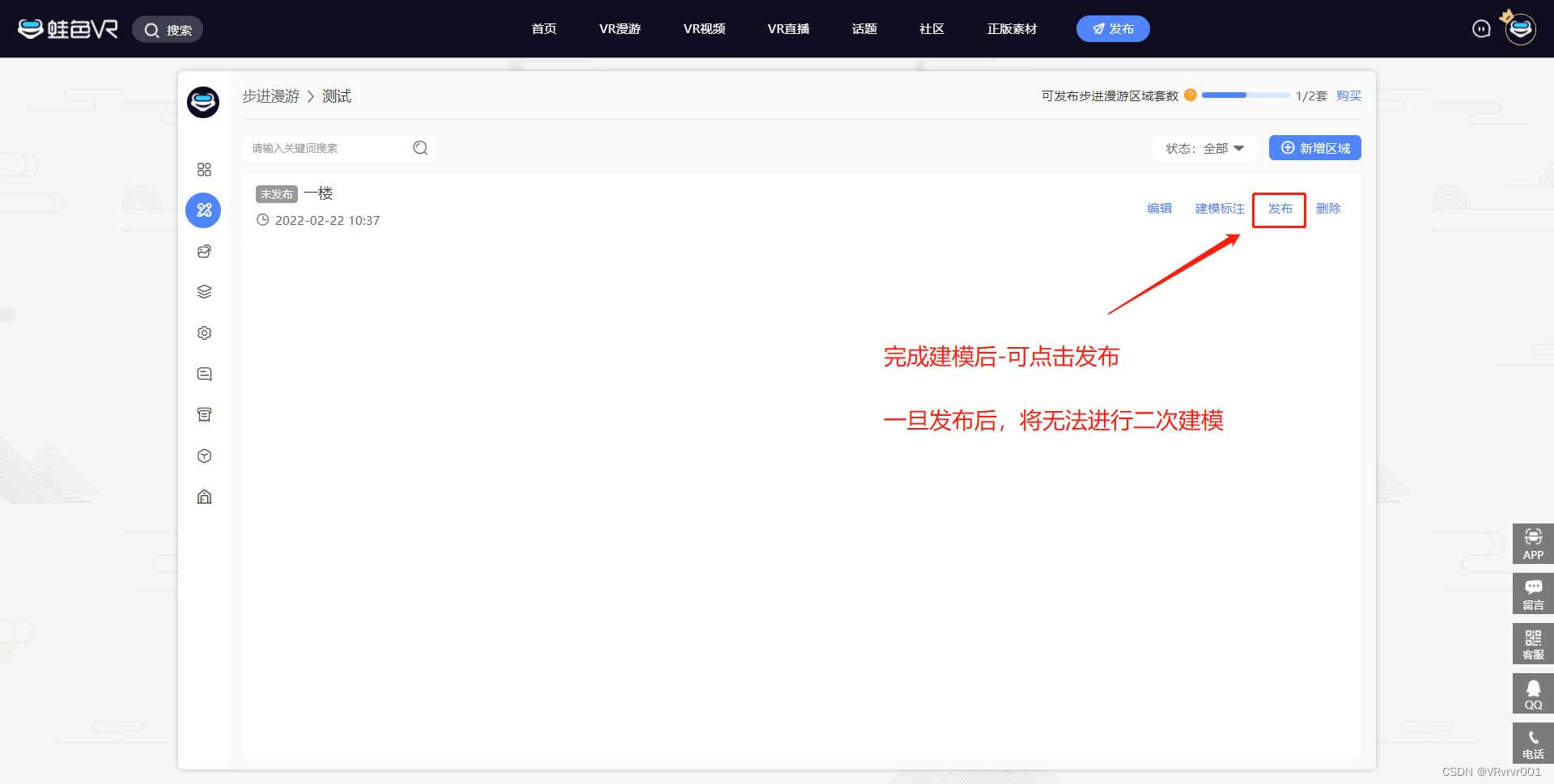 完成建模预览后,可回到区域页进行发布操作;