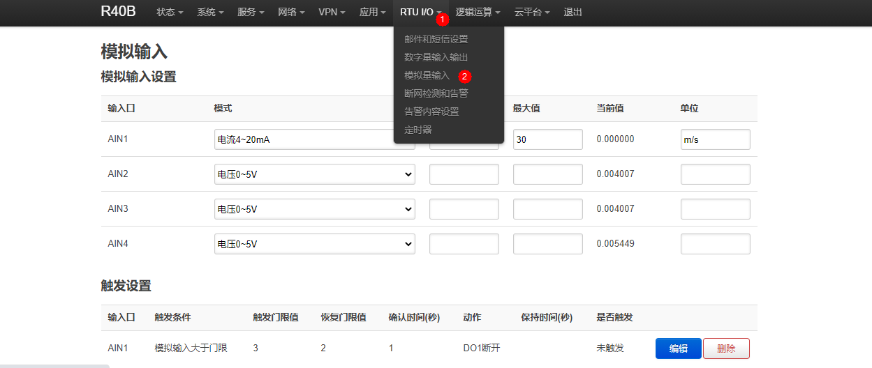 - 在AIN1输入一行(因为风速变速器选择的是该口)中,选择“电流4~20mA”(风速变送器的输出为该值)。并且按照传感器推荐的将最小值设置为0,最大值设置为30,单位设置为m/s。