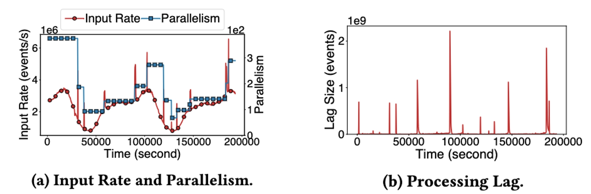 这里展示了自动扩缩容在一个大流量生产作业上的执行效果:图 a 展示了作业并行度随着作业入流速率变化的情况,图 b 展示了期间消息积压的变化。可以看到 StreamOps 可以有效的根据作业入流速率扩缩容,并且可以节约至少 60% 的 CPU 资源。当然也可以看到扩缩容本身会造成消息的暂时堆积,所以各作业可以更细粒度地调参来权衡扩缩容的开销和自动扩缩容的灵敏度。