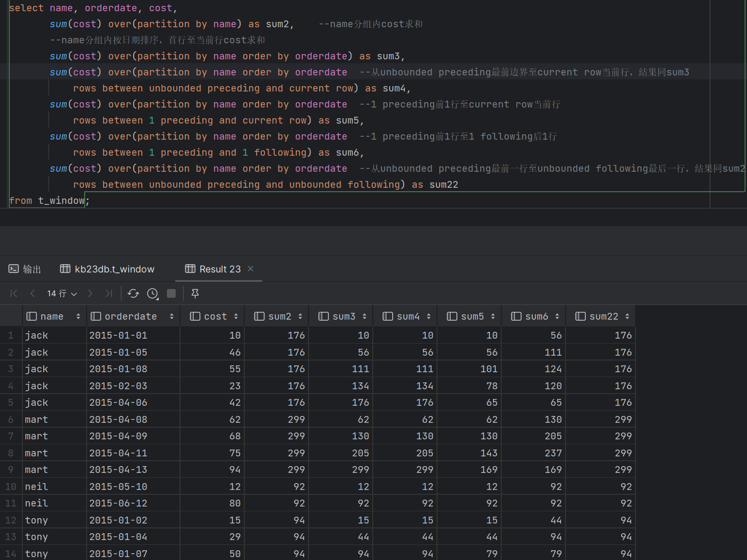- 窗口定义-1 (1)窗口定义由[ 用于进一步细分结果并应用分析函数 (2)支持两类窗口定义 行类型窗口 范围类型窗口 (3)RANK、NTILE、DENSE_RANK、CUME_DIST、PERCENT_RANK、LEAD、LAG和ROW_NUMBER函数不支持与窗口子句一起使用 - 窗口定义-2 (1)行窗口:根据当前行之前或之后的行号确定的窗口 ROWS BETWEEN (2) UNBOUNDED PRECEDING : 窗口起始位置(分组第一行) CURRENT ROW:当前行 N PRECEDING/FOLLOWING:当前行之前/之后n行 (3) UNBOUNDED FOLLOWING : 窗口结束位置(分组最后一行) CURRENT ROW:当前行 N PRECEDING/FOLLOWING:当前行之前/之后n行