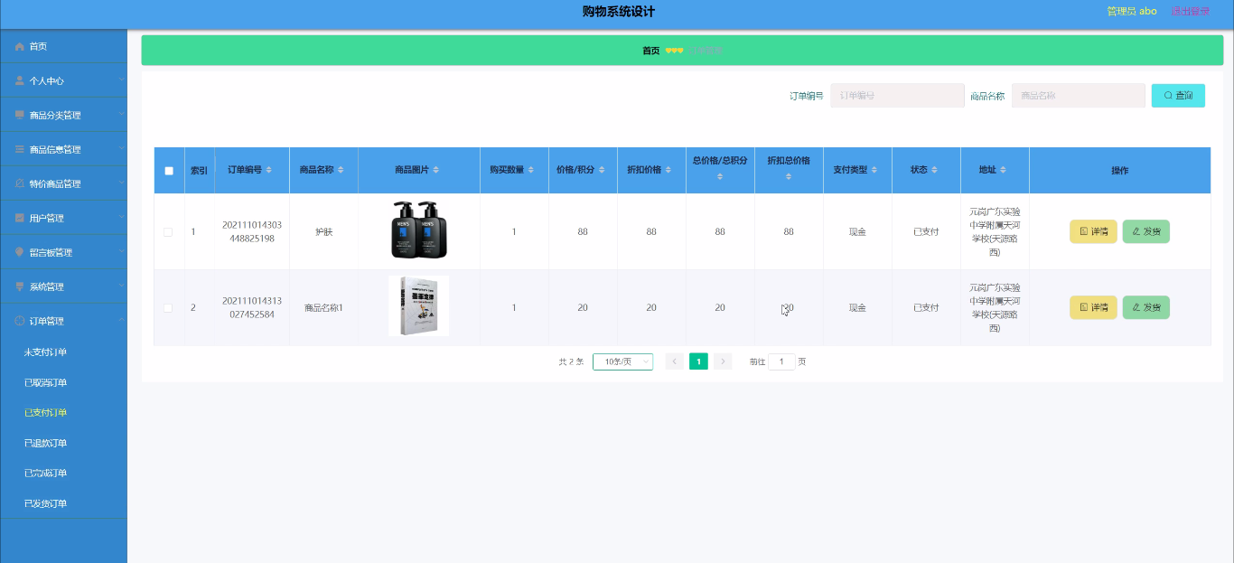 管理员进入到订单管理界面,通过界面的任务大厅,登录成功后进入到系统可以查看订单编号、商品名称、商品图片、购买数量、价格/积分、折扣价格、总价格/总积分、折扣总价格、支付类型、状态、地址等信息,进行相对应操作,如图5-16所示。