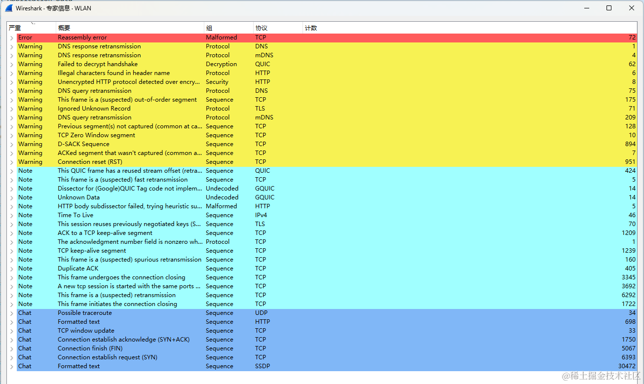 Wireshark的专家信息是非常强大的一个分析模块,分别对错误、警告、注意、对话等数据信息做出分类和注释,对网络故障分析提供了强有力的信息依据,让你准确快速地判断出故障点,并进行下一步处理。