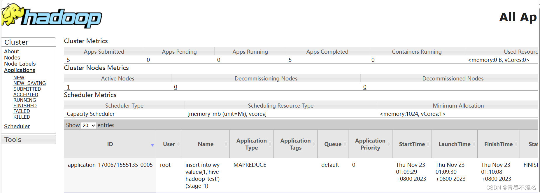 INFO : Starting Job = job_1700671555135_0005, Tracking URL = http://dss-service:18088/proxy/application_1700671555135_0005/