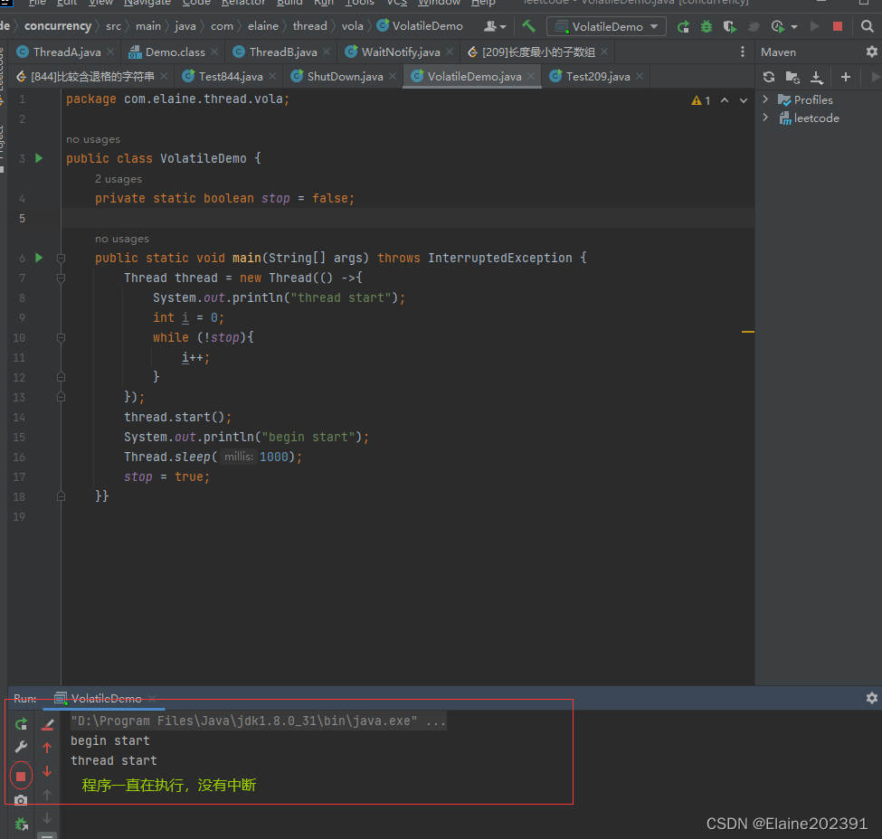 我们知道终止线程的方式有调用interrupt()和改变终止标识两种。下面的改变终止标识示例中,thread不会终止。