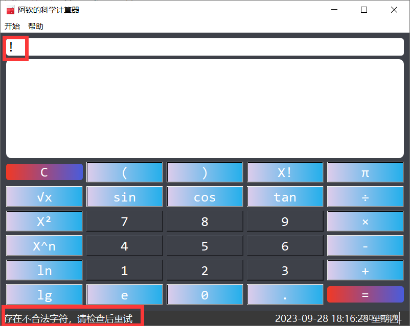 对于用户在实际应用的过程中出现的相关非法操作,程序会通过相关提示来告知用户进行清空或者其他操作来重新进行运算: