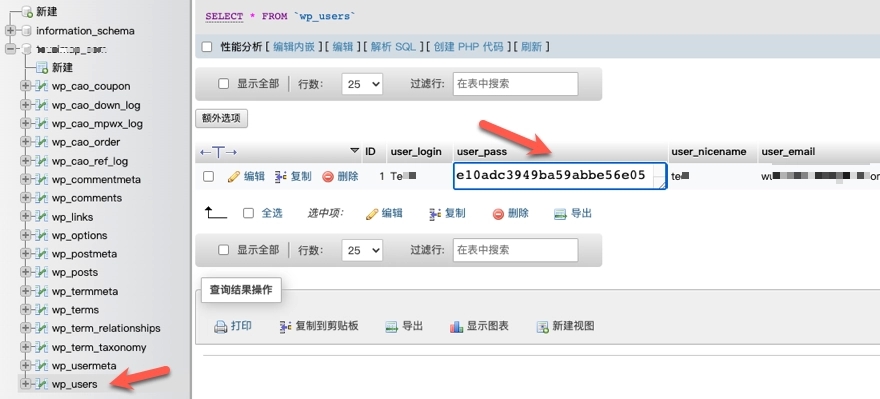 在数据库管理界面中,找到名为"wp_users"的数据表,然后将密码字段更改为新密码。请注意,密码字段中的密码是经过 MD5 加密的,下面提供了一个经过 MD5 加密的密码示例:e10adc3949ba59abbe56e057f20f883e(对应明文密码:123456)。您可以将这个加密后的密码填入相应用户的密码字段中。