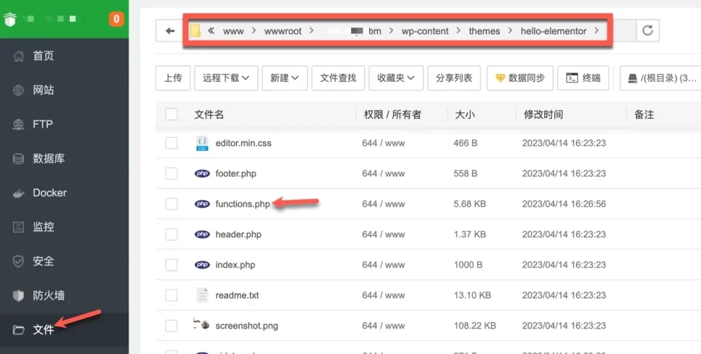 另外,如果无法访问数据库,您可以考虑使用FTP登录。无论是宝塔面板搭建的网站还是虚拟主机搭建的网站,只需要找到相应的文件路径:网站根目录->wp-content->themes->当前正在使用的主题->functions.php。