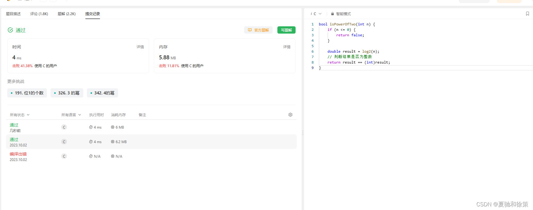 第一条思路 就是对n取log2看是否为整数如果为整数说明就是2的幂次方返回True反之返回false.这样新的问题就出现了在C语言或者C++或者JAVA中该如何使用对数函数?
