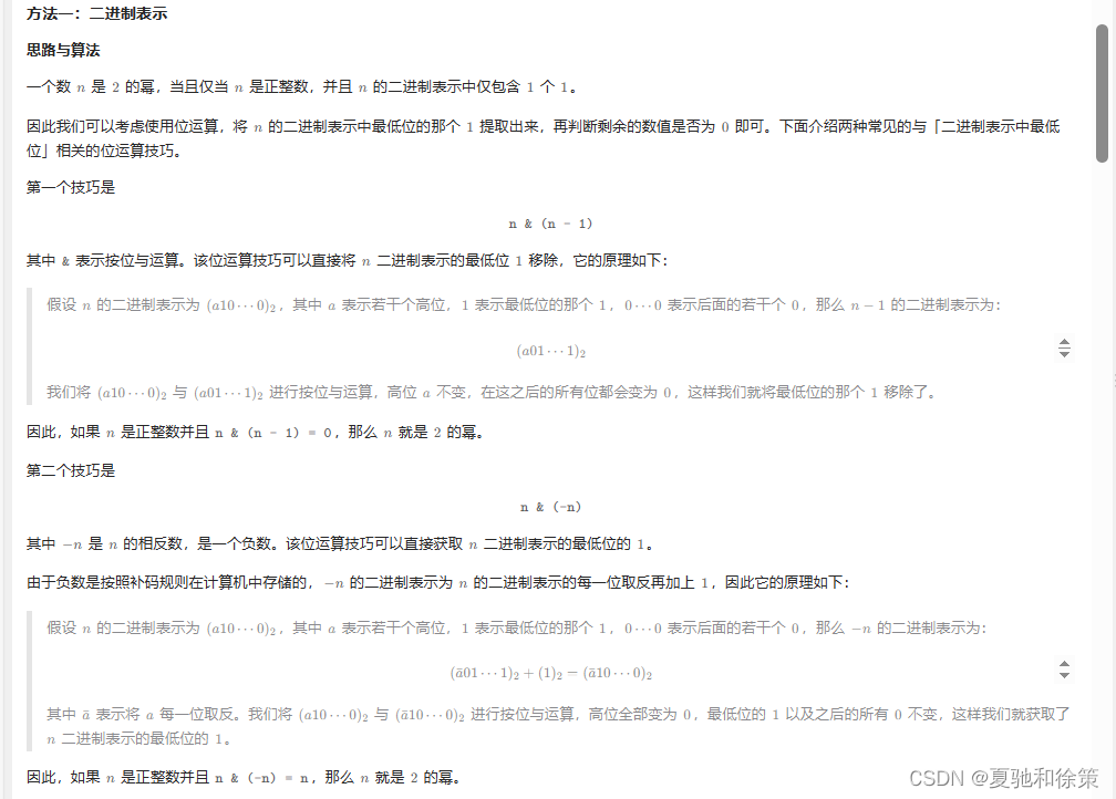 执行`n & (-n)`得到`0010`。这表示`n`的最低位的1是在第二位上。但对于确定2的幂,我们关心的是这个操作的结果是否等于`n`,因为只有这样`n`才只有一个1。