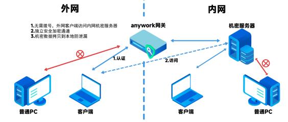 在企业内网部署深信达anywork零信任沙盒系统,将外网服务器作为网关服务器,对git/svn或其他业务系统进行相关设置,即可做到无论员工身处何地,都可以快速接入公司内网获得数据和资料,开展远程办公。工作相关的涉密数据只能够落到到沙盒安全空间内,无法拷走,在做到灵活条件办公的同时,也能保障数据的安全。