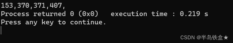 // 100-1000之间的水仙花数 #include<stdio.h> #include<math.h> int main() { int i; int a,b,c; for(i=100;i<1000;i++) { a=i%10; b=(i/10)%10; c=i/100; if(pow(a,3)+pow(b,3)+pow(c,3)==i) printf("%d,",i); } return 0; }