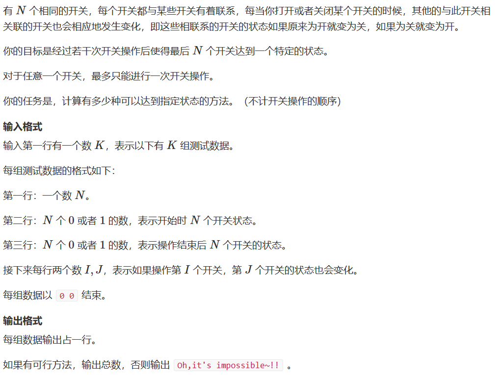 可以由此建立异或方程组,每一行代表一个开关,第i行第j列如果为1代表第i个开关受第j个开关掌控,为0代表不受第j个开关掌控