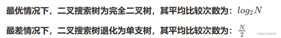 插入和删除操作都必须先查找,查找效率代表了二叉搜索树中各个操作的性能。对有 n 个结点的二叉搜索树,若每个元素查找的概率相等,则二叉搜索树平均查找长度是结点在二叉搜索树的深度 的函数,即结点越深,则比较次数越多。但对于同一个关键码集合,如果各关键码插入的次序不同,可能得到不同结构的二叉搜索树: