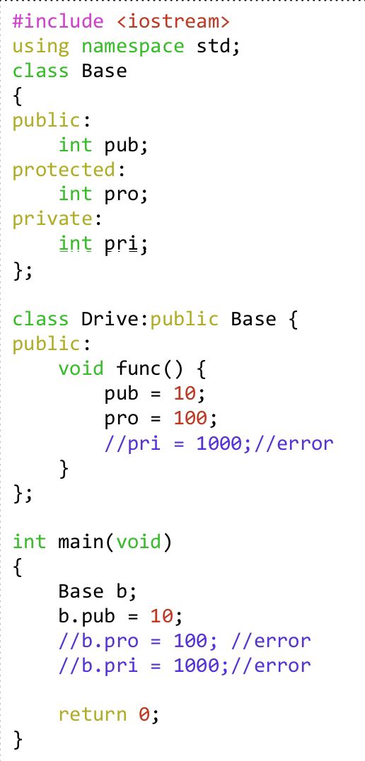 有public, protected, private三种继承方式,它们相应地改变了基类成员的访问属性。
