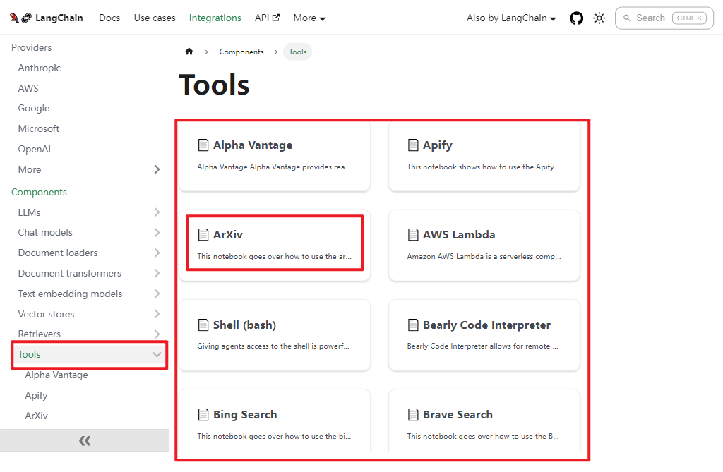 可以直接调用LangChain自带的工具(比如,ArXiv),也可以调用自定义的工具。LangChain自带的部分工具[2],如下所示: