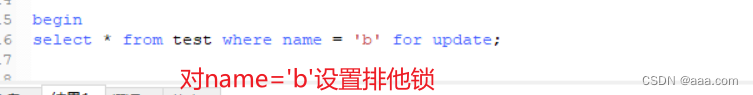 | select * from test where name = 'b' for update;//加排他锁,模拟并发,锁定name='a'; | |