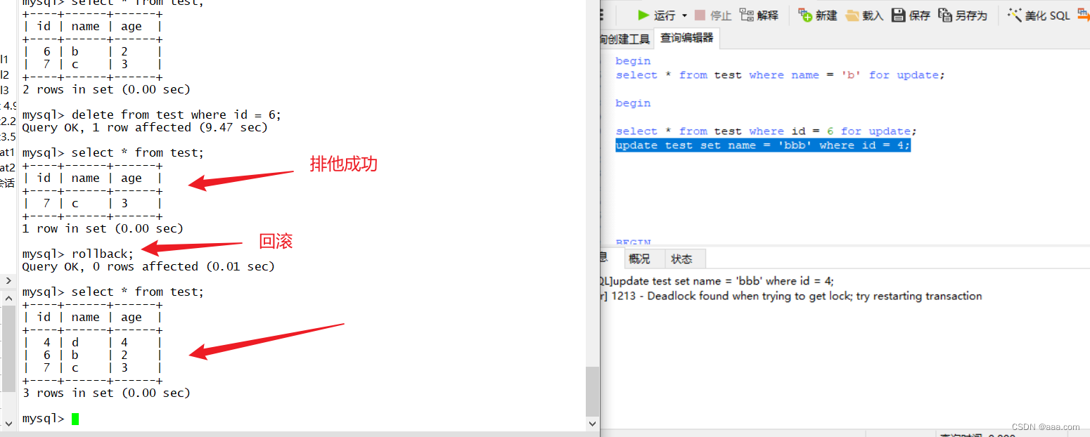 | delete from test where name='b'; //死锁产生 | |