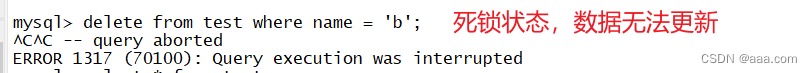 | update test set name='abc' where name='a'; #死锁产生。因为会话1中name='a'的行还在删除过程中,该行已被锁定 | |
